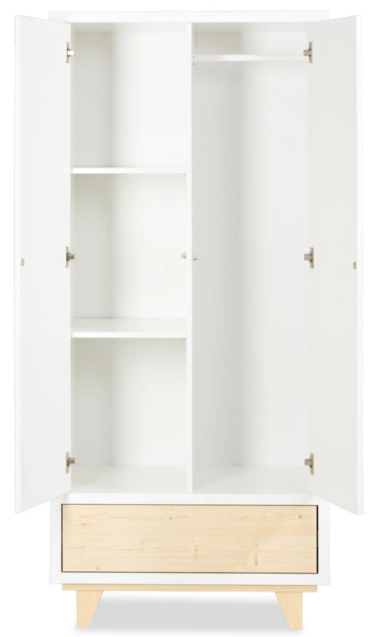 De kast heeft 2 deuren met een roede aan de ene kant en 2 planken (3 vakken) aan de andere kant. Ook heeft deze kast een grote lade waarin je bijvoorbeeld lakentjes en dekentjes kan opbergen. De deuren en de laden openen door het ‘Push to open’ systeem.