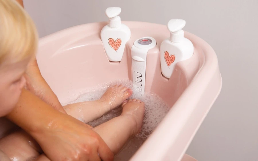 Daarnaast heeft het badje twee zeepdispensers voor shampoo en zeep. Ook dient de badthermometer als afvoerstop, wanneer je deze omhoog duwt loopt het water er via de meegeleverde badslang langzaam uit. Op deze manier is zwaar tillen overbodig!