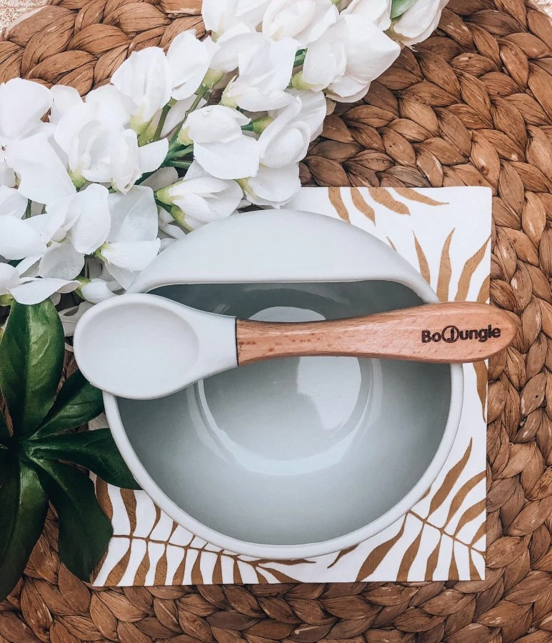 Superhandig siliconen kommetje van het merk Bo Jungle. Het kommetje bevat een zeer handige grote zuignap aan de onderkant zodat je kleintje zijn kommetje niet op de grond kan laten vallen / kan omstoten. Het kommetje wordt geleverd inclusief een handig ergonomisch gevormd lepeltje met houtlook steel.