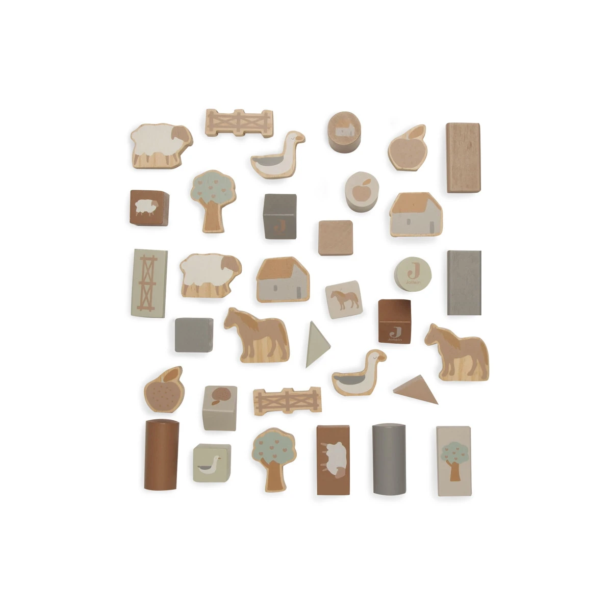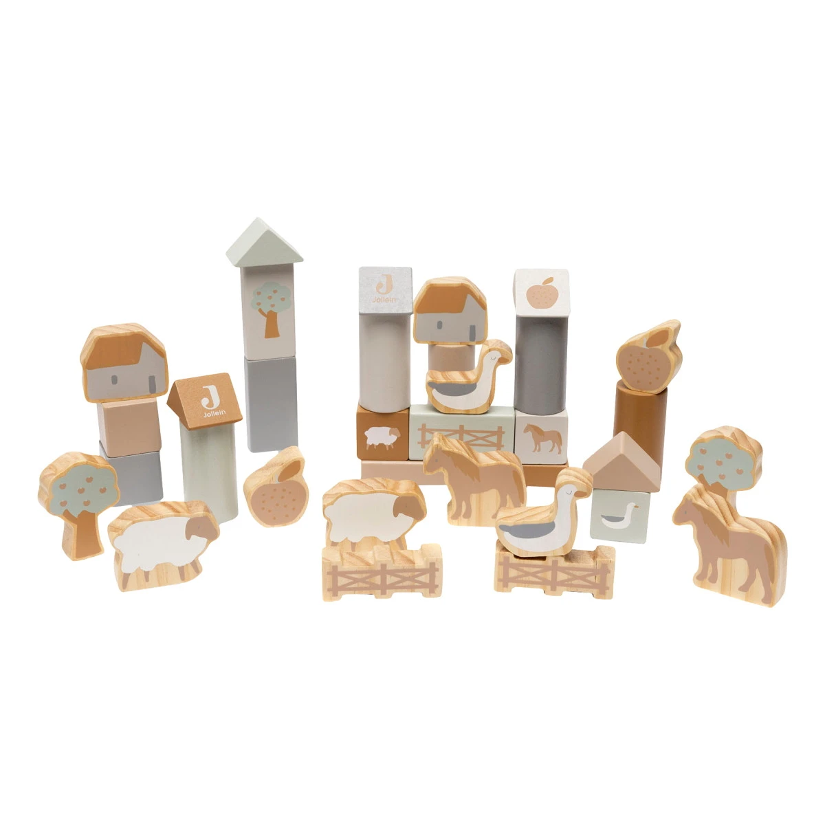 Met deze Farm houten blokkenset van Jollein kan jouw kindje zich helemaal uitleven en zijn fantasieën laten gaan. De set bestaat uit 34 blokken in allemaal verschillende kleuren en vormen, daarnaast zitten er ook nog een aantal boerderijdiertjes bij.