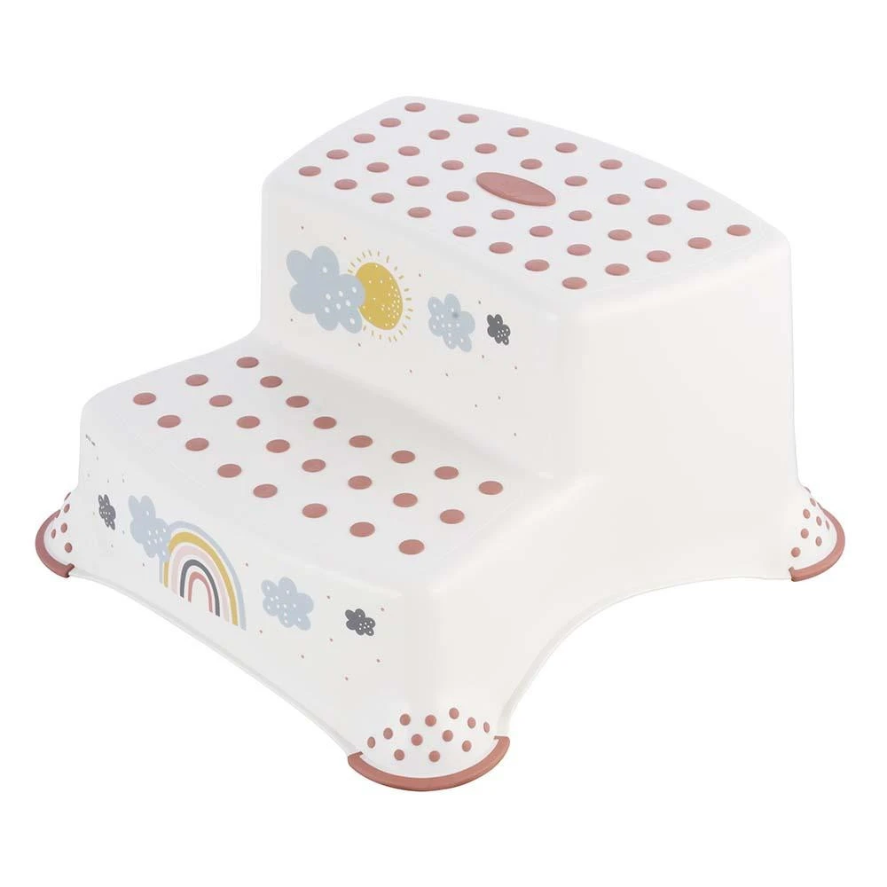 Het opstapje is wit van kleur en is voorzien van leuke afbeelding van een vrolijke regenboog. De nieuwe technologie van overprint (IML) voorkomt dat de afbeelding vervaagt of loslaat.
