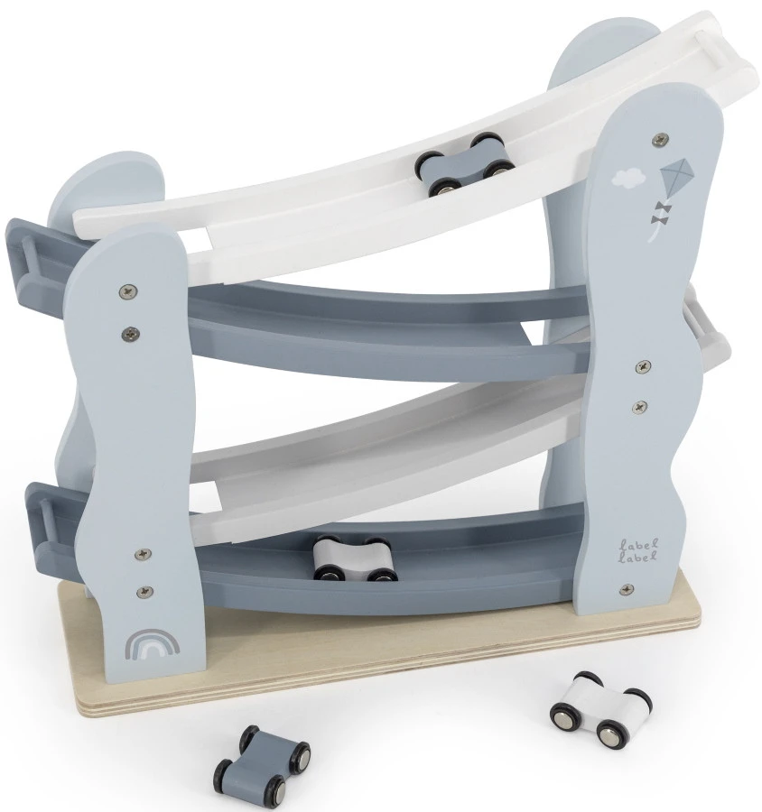 Je kleine zal urenlang speelplezier beleven met deze houten autobaan van Label Label! Zet de autootjes één voor één bovenin de autobaan en laat ze naar beneden racen! Er worden 4 autootjes meegeleverd, zo kan je kleine goed in de gaten houden welke als eerst beneden is.