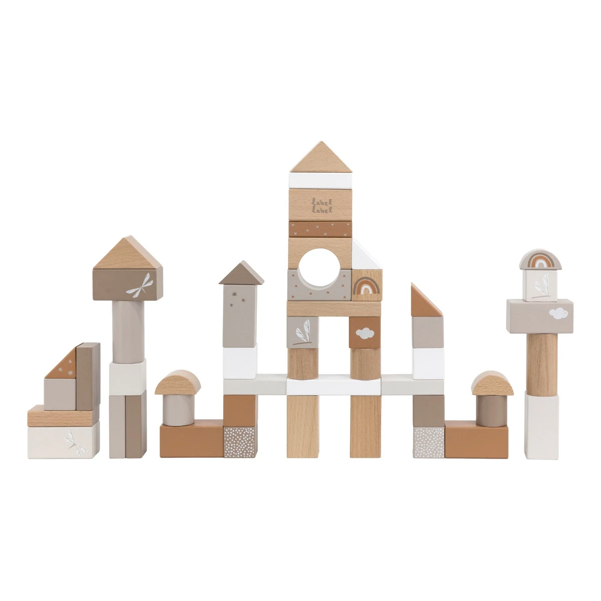 Wat een bouwplezier met deze blokkenset van Label Label! Je kindje raakt niet uitgespeeld, want de set bestaat uit maar liefst 50 stuks blokken! De toren kan meerdere manieren in elkaar gezet worden. De blokken hebben een mooie nougat kleur en zijn voorzien van verschillende figuurtjes.
