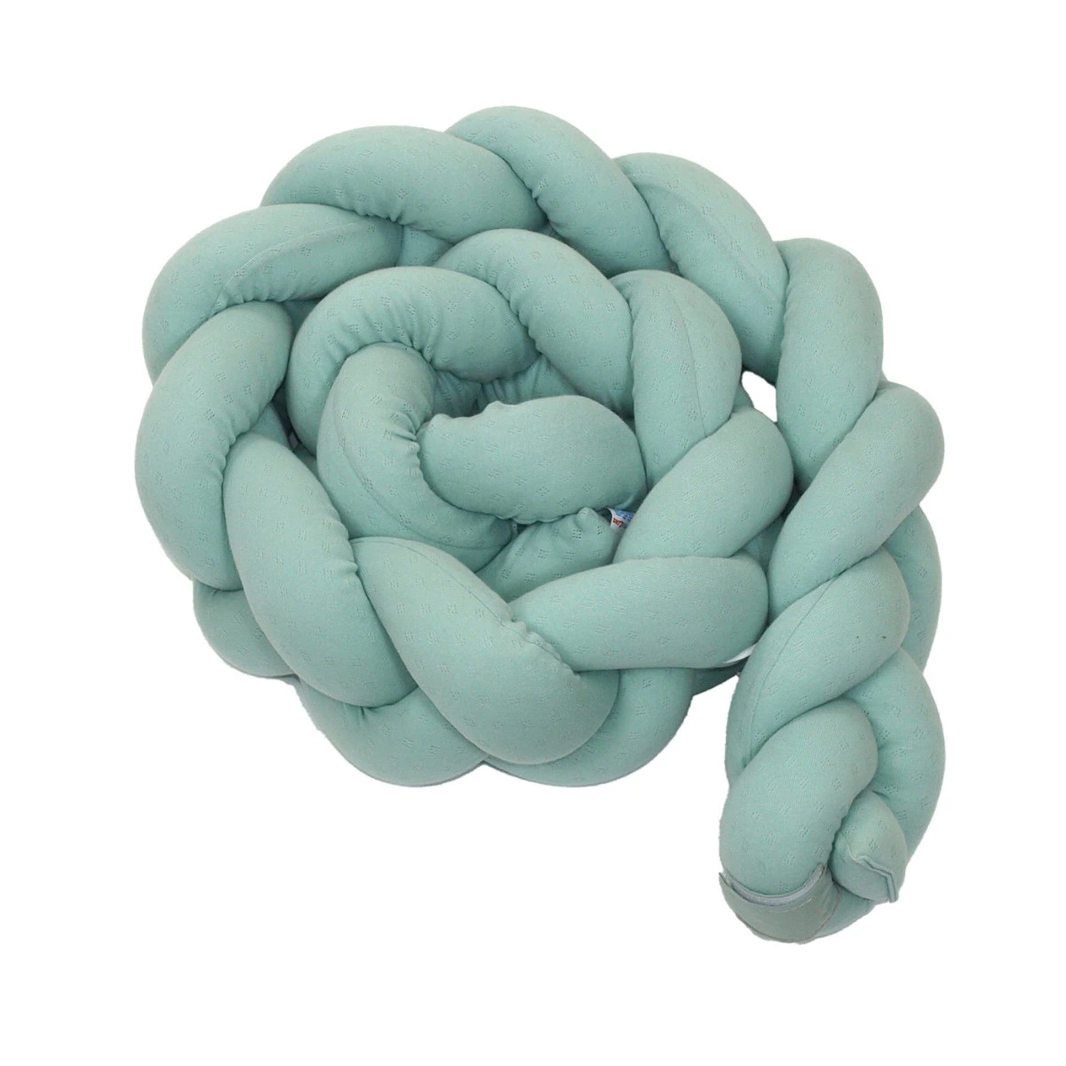 Bescherm je kleintje tegen de harde spijlen van zijn/haar bedje met deze braided bedbumper van MamaLoes Amy! Deze bedbumper is gevlochten en is verkrijgbaar in een mooie stonegreen kleur. Door de toffe Ajour afwerking krijgt de bumper een super luxe uitstraling die mooi zal staan in elke kinderkamer.