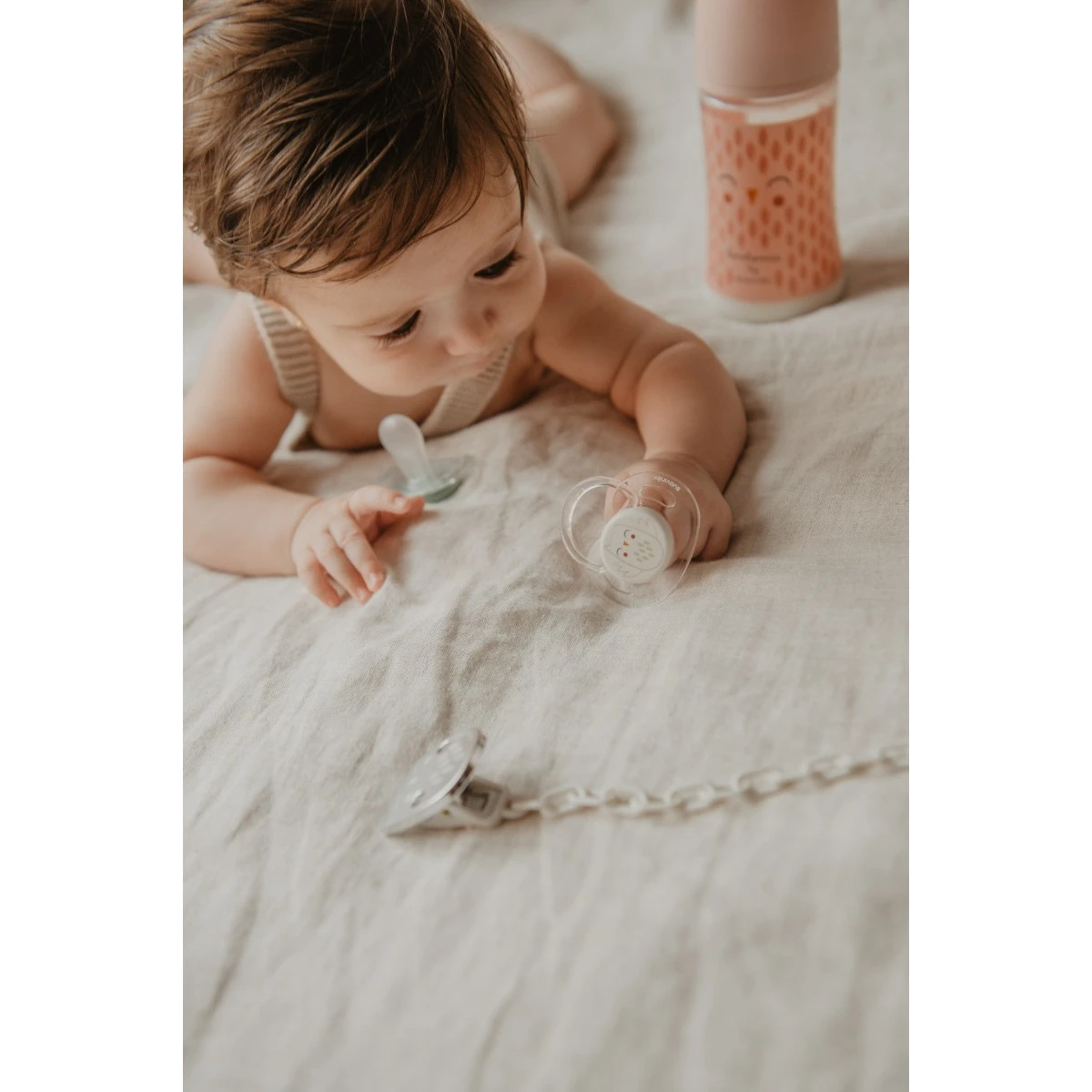 De fles heeft een inhoud van 270 ml en een siliconen speen. De Medium Flow speen heeft een normale uitstroomsnelheid. Deze speen kan naast melk en water ook gebruikt worden met dun gepureerd sap of pap. Hij is geschikt voor kindjes vanaf 3 maanden en het schattige design maakt de fles helemaal af!