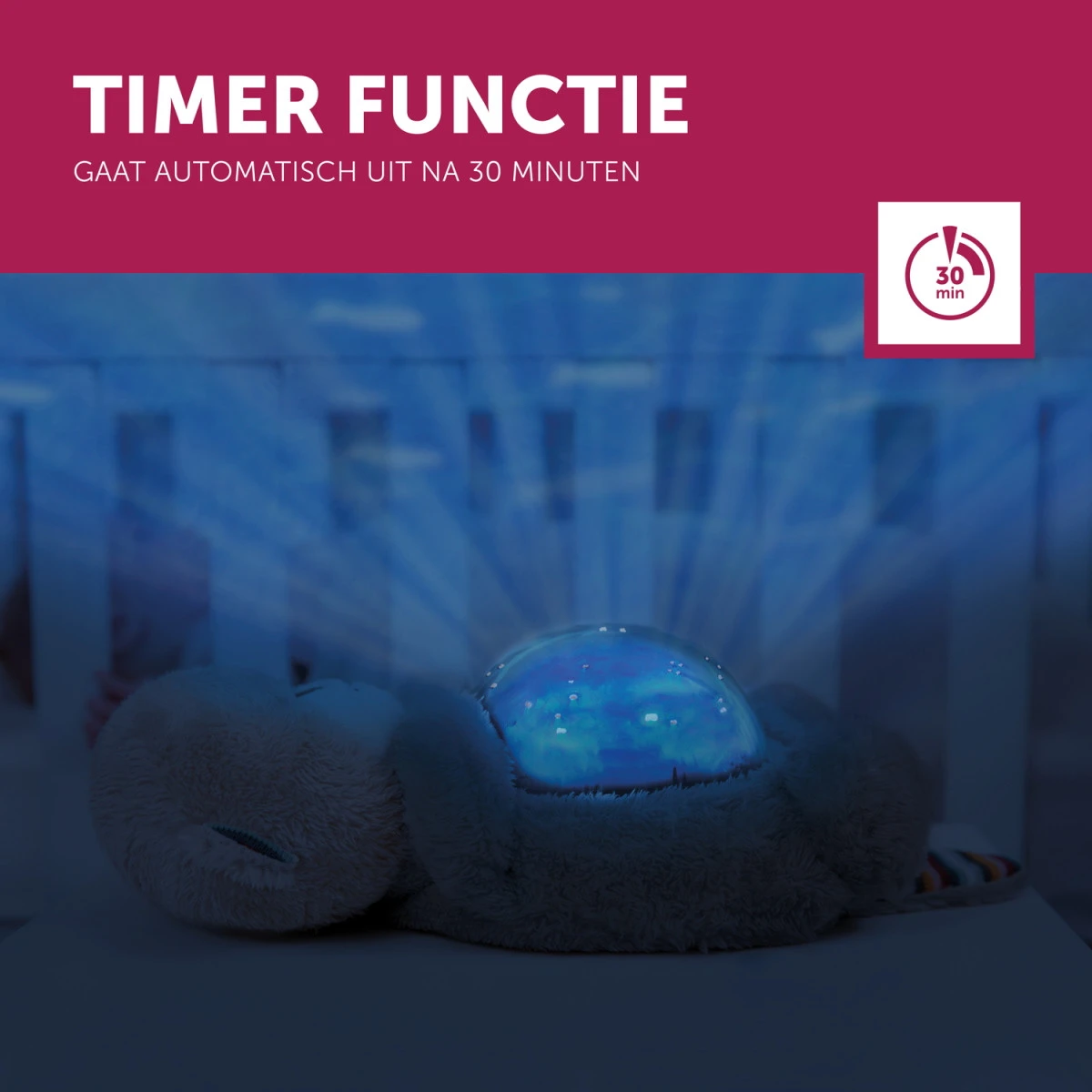 - Keuze uit 3 soorten geluiden: oceaan, hartslag of slaapliedjes